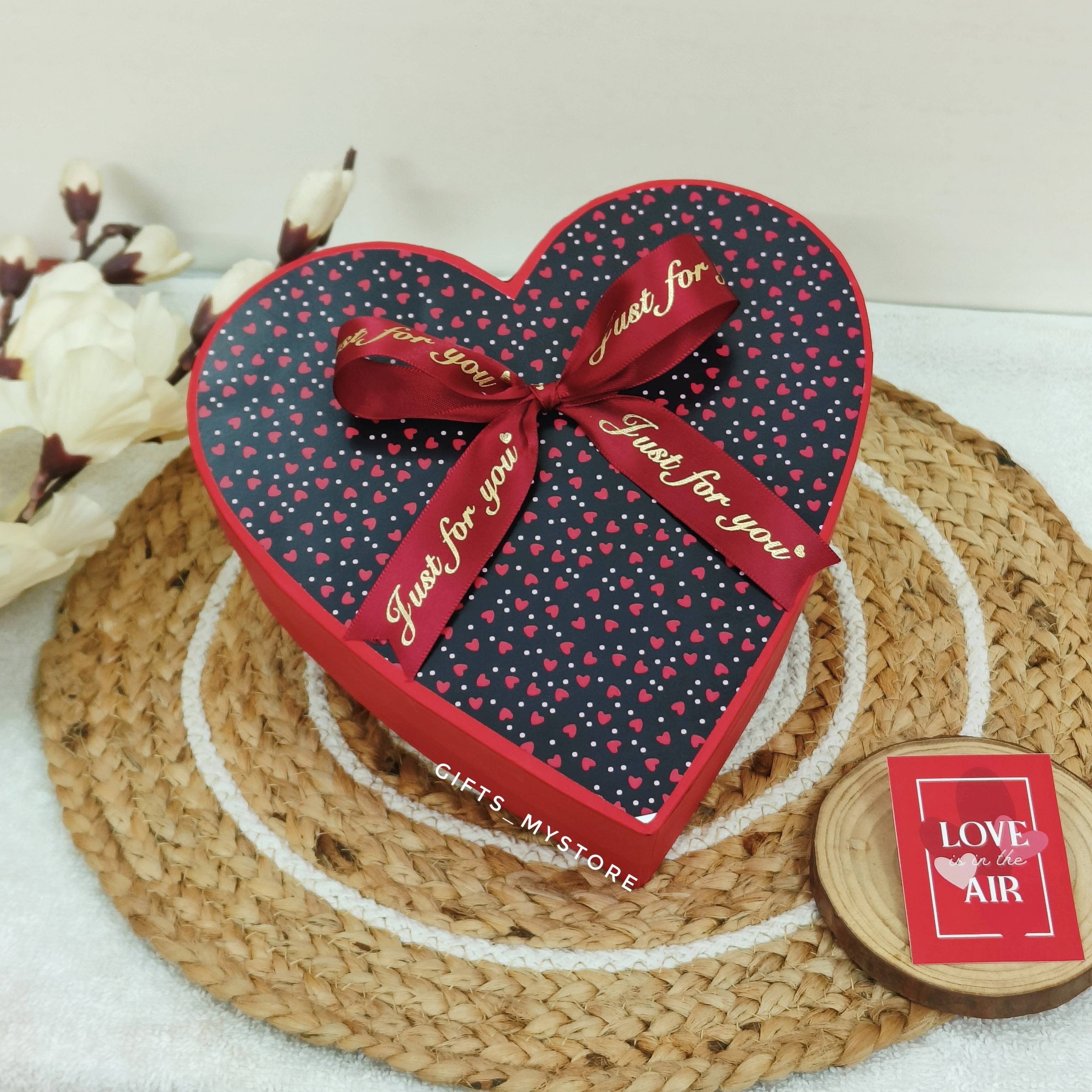 Make your loved one feel truly special with this beautifully designed heart-shaped gift box. Tied with an elegant ribbon that reads “Just for you”, the box opens to reveal a delightful arrangement of romantic keepsakes, sweet indulgences, and heartfelt surprises. Every detail is thoughtfully placed to create a moment of joy and love at first sight.