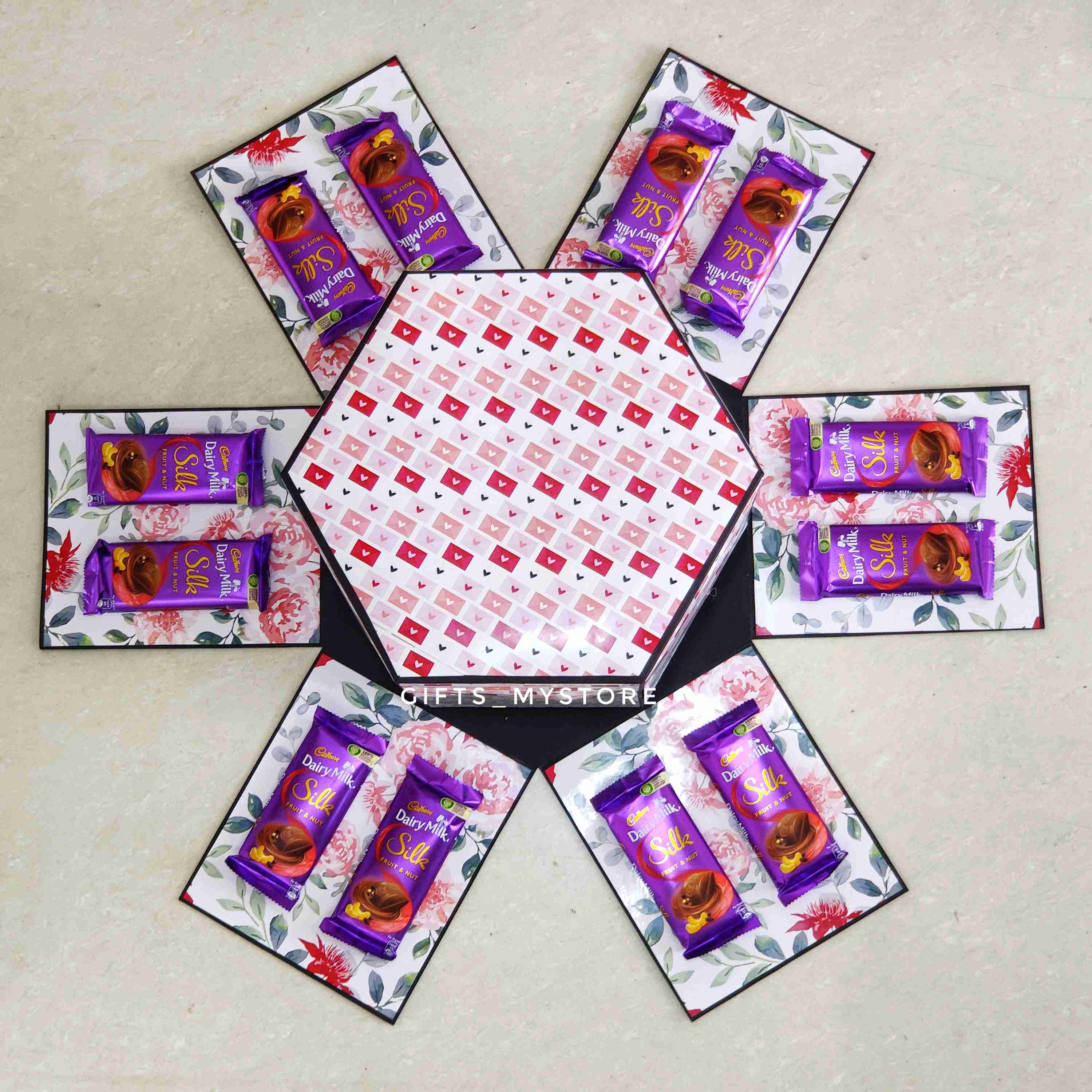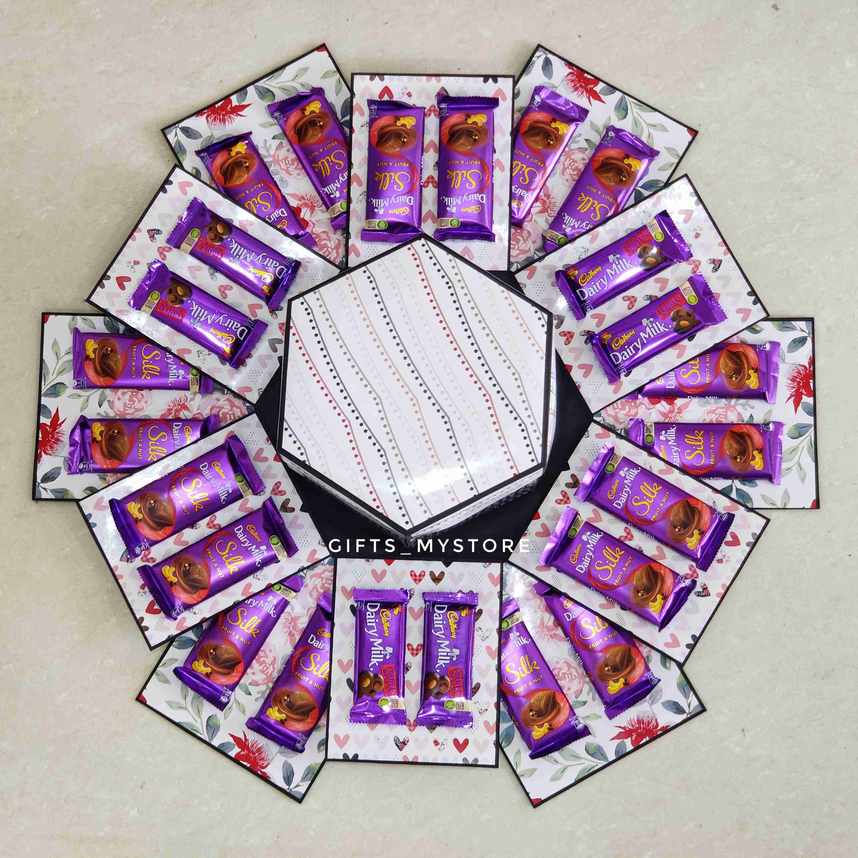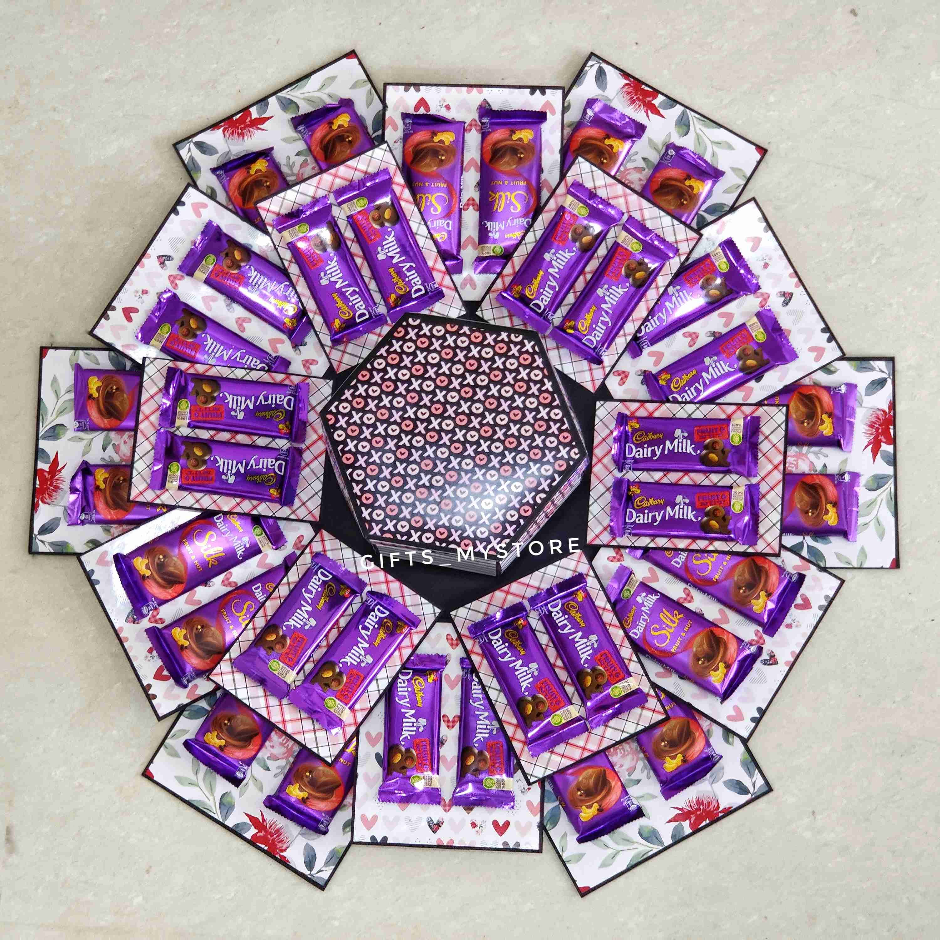 Surprise your loved ones with this luxuriously crafted and decorated premium Chocolate explosion box. Each layer reveals silky chocolate treasures, designed to melt hearts and create sweet memories.