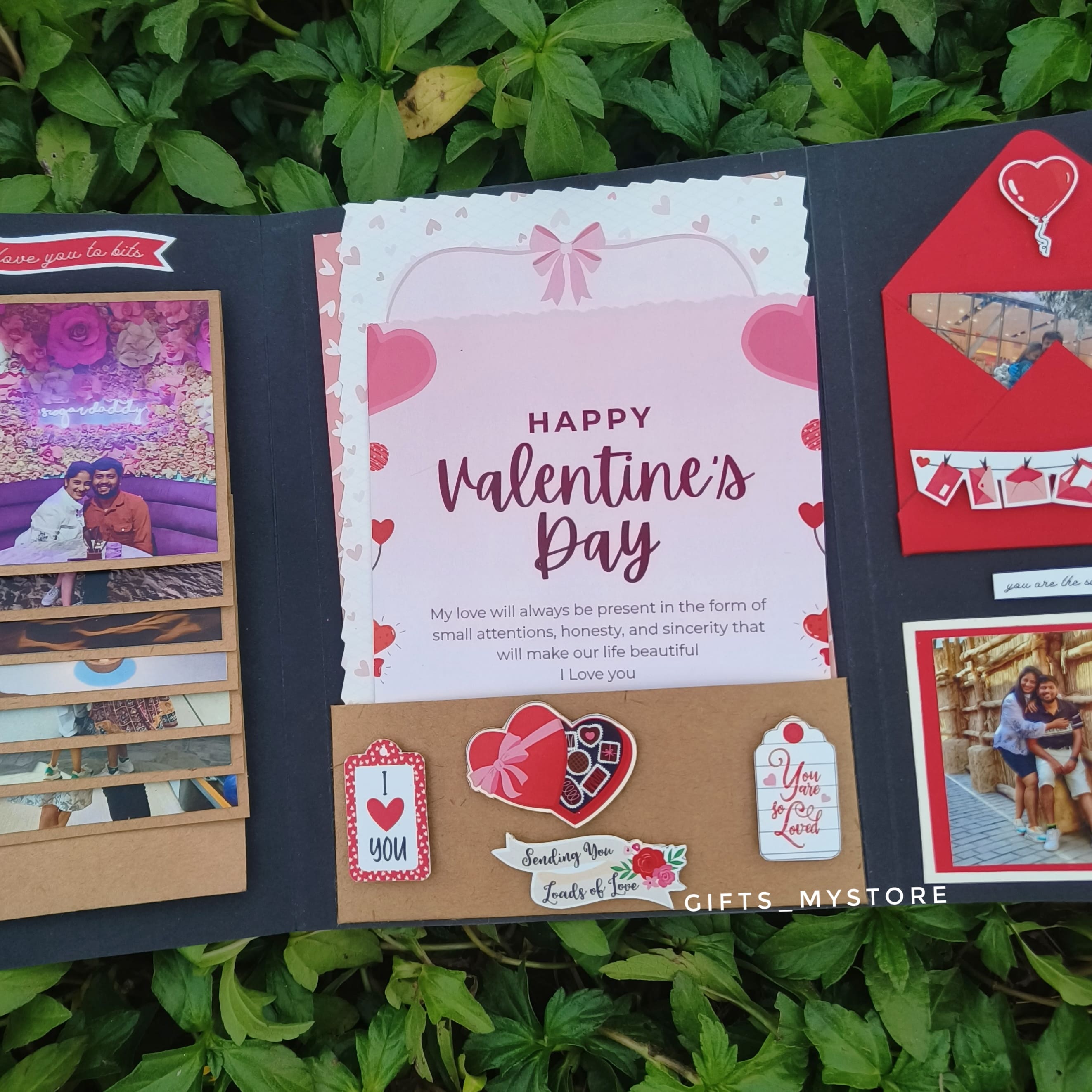 Celebrate your love story with our Personalized Valentine Memory Handbook — a beautifully handcrafted keepsake designed to hold your most cherished memories. This premium scrapbook is thoughtfully created with layered photo frames, love-themed envelopes, cute tags, and heartfelt Valentine messages, making every page a delightful surprise.