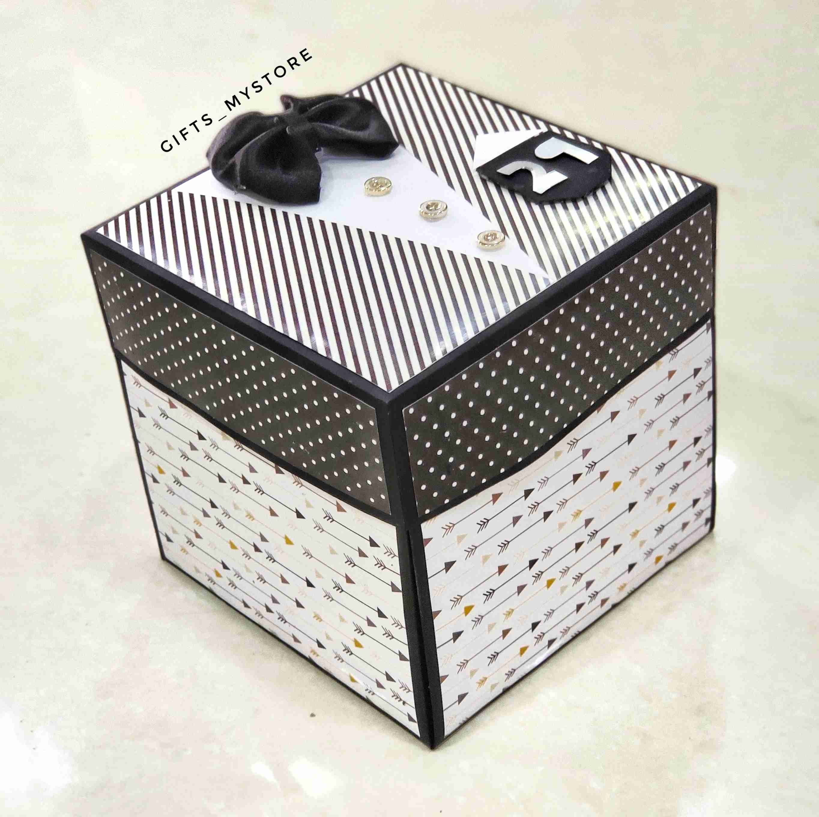 Make birthdays and milestone celebrations extra special with our elegant Tuxedo-Themed Giant Photo Explosion Box. Designed like a classic tuxedo suit on the outside, this box opens up to reveal multiple layers of beautifully arranged photo panels, mini surprise cards, and decorative elements that unfold into a stunning memory display. It has Hidden Pockets in all the sides in which there will be special Photos and Messages. In the middle there is infinite Photo Cube. Perfect for capturing precious moments in a unique and stylish way, this handcrafted box is a keepsake your loved one will cherish forever.